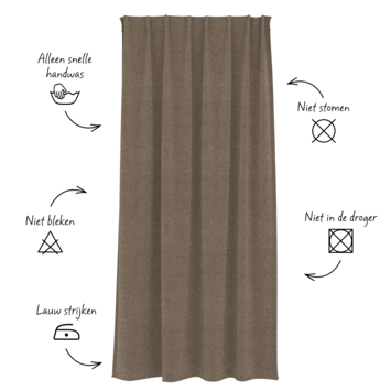 Je kunt dit gordijn met de hand wassen in lauw water en evt. lauw strijken, maar het gordijn is niet geschikt voor de centrifuge en droger.