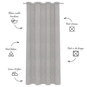 Je kunt dit gordijn met de hand wassen in lauw water en evt. lauw strijken, maar het gordijn is niet geschikt voor de centrifuge en droger.