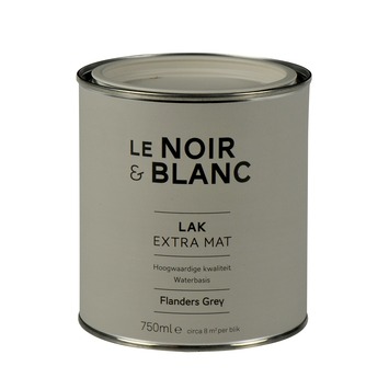 De Le Noir & Blanc lak extra mat flanders grey 750 ml maakt onderdeel uit van een zeer bijzondere serie verven in fraaie vergrijsde tinten. De lak op waterbasis droogt snel en is reukarm. Daarnaast is de lak krasvast en heeft de lak een extra matte afwerking. Voor een extra mat effect breng je de verf in dikkere lagen aan. Door de toevoeging van hoogwaardige grondstoffen wordt een rijke lak gecreëerd die een ware toevoeging aan uw interieur vormt. De lak is met name bedoeld voor gebruik binnenshuis. De lak is geschikt voor deuren en kozijnen, maar ook voor meubelen of andere decoratieve toepassingen. De lak kan eenvoudig worden aangebracht met een kwast of een roller. Het blik bevat 750 milliliter lak in de kleur flanders grey, dit is genoeg voor een oppervlakte van zo'n 8 vierkante meter.