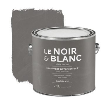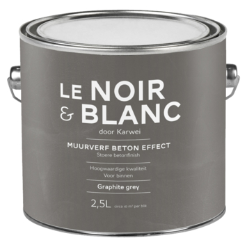 Met muurverf beton effect graphite grey 2,5 liter van Le Noir & Blanc haal je iets bijzonders in huis waarmee je heel eenvoudig en snel een bijzonder betoneffect maakt. Deze muurverf heeft een stoere betonfinish voor een robuuste, industriële betonlook op je muur en in je interieur. Het effect wordt versterkt door de muurverf in twee lagen aan te brengen met een verfroller of blokkwast en daarna losjes uit te strijken met een spaan of spatel. Voor toepassing op droge ondergronden zoals schuur- en pleisterwerk, beton en cement, gipsplaat, goed vastzittend behang, board en met muurverf behandelde oppervlakken.