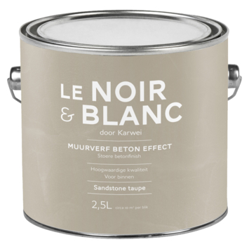 Met muurverf beton effect sandstone taupe 2,5 liter van Le Noir & Blanc haal je iets bijzonders in huis waarmee je heel eenvoudig en snel een bijzonder betoneffect maakt. Deze muurverf heeft een stoere betonfinish voor een robuuste, industriële betonlook op je muur en in je interieur. Het effect wordt versterkt door de muurverf in twee lagen aan te brengen met een verfroller of blokkwast en daarna losjes uit te strijken met een spaan of spatel. Voor toepassing op droge ondergronden zoals schuur- en pleisterwerk, beton en cement, gipsplaat, goed vastzittend behang, board en met muurverf behandelde oppervlakken.