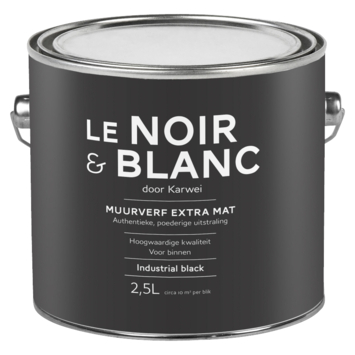 De Le Noir & Blanc muurverf extra mat industrial black 2,5 liter maakt onderdeel uit van een zeer bijzondere serie verven in fraaie vergrijsde tinten. De extra matte muurverf geeft de wand een poederzachte touch. Iedere kleur uit het palet krijgt door deze zachtheid vanzelf een rijke maar ingetogen uitstraling. Hiermee is de verf een optimale verfraaiing voor je woning. Deze muurverf is eenvoudig aan te brengen met een roller of blokkwast en geeft bij twee lagen een poederig effect, net zoals krijtverf. Het blik bevat 2,5 liter muurverf, dit is genoeg voor een rendement van 20 vierkante meter. Voor het beste resultaat van kleur raden we aan 2 lagen te gebruiken, je hebt dan genoeg voor een oppervlakte van ca 10 vierkante meter. Nog niet zeker van je kleur? Test dan eerst je kleur met de handige Le Noir & Blanc kleurtesters. Verkrijgbaar bij jouw KARWEI en online.