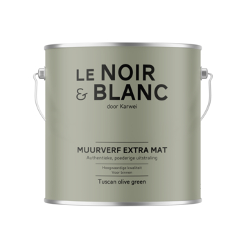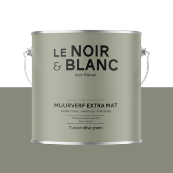 Met Le Noir & Blanc muurverf tuscan olive green extra mat 2,5 liter geef je je muur een diepe en poederige uitstraling. De extra matte afwerking zorgt voor een zachte look zonder glans, waardoor kleuren rustig en vol overkomen. Deze verf kun je in de bouwmarkt of online laten mengen in elke kleur en is geschikt voor muren in droge ruimtes binnenshuis.
