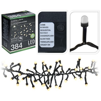 De extra grote 384 bollampjes warmwit van 8 mm geven meer lichtopbrengst dan de normale micro LED-lampjes. Deze Cluster LED-kerstverichting voor buiten (kan natuurlijk ook voor binnen). Deze LED cluster kerstverlichting is voorzien van een 8 standen schakelaar met geheugen waarmee je de verlichting op diverse manieren kan laten knipperen of gewoon op één stand zetten en dat is normaal brandend. Lengte clustersnoer 235 cm met een 3 meter aanloopsnoer compleet met een IP 44 adapter/stekker.