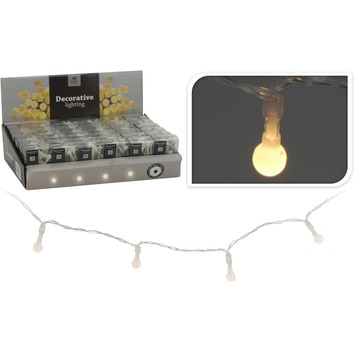 Kunststof balletjes in de kleur wit met warmwitte LED verlichting, werkt op 2 AA batterijen (niet bijverpakt). Totale lengte van het snoer met de 10 kunststof balletjes is 130 cm. AA batterijen apart verkrijgbaar. Te gebruiken in een mini kerstboom of in een kerstdecoratie voor op tafel.