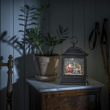 Breng je interieur in kerststemming met deze watergevulde LED verlichte sneeuwlantaarn met kerstman in arreslee motief 4351-000 van het Zweedse premium kerstverlichting merk Konstsmide. Deze zeer populaire -door een warmwitte LED verlichte- XL sneeuwlantaarn met een forse afmeting van 17.5x25cm werkt naar keuze of meegeleverde trafo of op 3x C batterijen (niet meegeleverd) en is geschikt voor binnengebruik. De ingebouwde stille en krachtige motor zorgt voor een sfeervol en nostalgisch sneeuwvaleffect. Als de LED verlichte sneeuwlantaarn op batterijen wordt gebruikt is er geen sprake van een aansluitsnoer en kun je hem overal flexibel en naar eigen inzicht plaatsen, ook op plaatsen zonder stopcontact in de buurt. De verlichte lantaarn is een eyecatcher en een garantie voor romantische en nostalgische kerstsfeer en een aanwinst voor elk interieur. Kan als lichtdecoratie worden gebruikt op of in een open kast of dressoir, op een tafel of op de vensterbank. De lantaarn heeft een ingebouwde 5 uurs timer. Bij inschakeling van de timer werkt de verlichting 5 uur en schakelt deze daarna -in een 24 uurs cyclus- automatisch 19 uur uit. De sneeuwlantaarn kan naar keuze ook permanent ingeschakeld worden (on/off/5u timer). Werkt -indien gebruikt op batterijen- circa 100 uur op een set batterijen. De LED lichtbron is extreem duurzaam en zeer energiezuinig. De lichtbron is niet verwisselbaar maar dat is niet nodig omdat deze de hele levensduur van de lantaarn meegaat. Het energieverbruik van de lichtbron is slechts 0.1W. Het watergevulde frame is van kwalitatief hoogwaardig materiaal en stevig en degelijk uitgevoerd. Het is zo veel als mogelijk geproduceerd uit duurzame en herbruikbare of afbreekbare materialen, dus heeft een ecofriendly footprint. De vloeistof in de lantaarn blijft helder en verkleurt niet.