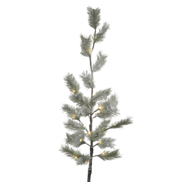 Deze verlichte dennentak is leuk te gebruiken als decoratie tijdens de feestdagen. Je kunt de tak gebruiken in een vaas of als versiering tussen andere kerststukjes. De kersttak is bedekt met een klein laagje sneeuw en voorzien van LED lichtjes in een warm witte kleur.