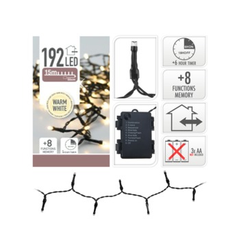 LED kerstverlichting op batterijen (niet bijverpakt) is een uitkomst wanneer je geen 230 volt stroompunt hebt in de buurt waar je kerstverlichting wilt plaatsen. Deze batterij LED kerstverlichting is ook geschikt voor gebruik buiten. Door de energiezuinige LED lampjes gaan de benodigde 3 AA batterijen lang mee. De brandduur is afhankelijk van de kwaliteit van de batterijen en de omgevingstemperatuur. Deze LED kerstverlichtingset met 192 lampjes is voorzien van een 8 standenschakelaar met geheugen waarmee je de verlichting op diverse manieren kan laten knipperen of gewoon op één stand zetten en dat is normaal brandend. Met de ingebouwde timer wordt je de kerstverlichting automatisch uit en aan geschakeld (6 uur aan en 18 uur uit). Wil je minder lampjes dan is deze LED kerstverlichting ook verkrijgbaar met 24, 48 of 96 LED lampjes. De AA batterijen zijn apart verkrijgbaar. Onder de 5 graden Celsius worden Lithium batterijen aangeraden, deze behouden hun capaciteit onder het vriespunt.
