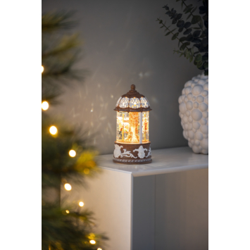 LED Sneeuwlantaarn waterspinner met roterende Caroussel Peperkoek figuurtjes, bruin, 22x11.2cm, 1L warmwit, on/off/5u timer, op batterij 3x AA (excl) of 1.8m USB aansluitsnoer, voor binnen