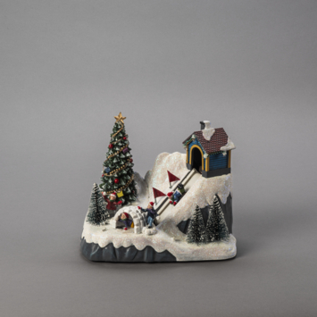 LED Wintertafereel Skipiste en kerstboom 21.5x17cm bxh, 19 LED multicolor, animatie, muziek, op USB kabel of batterij 3x AA (excl), voor binnen