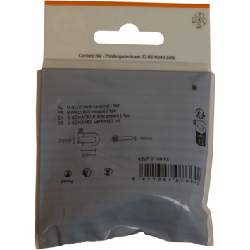 Sluiting in verzinkt staal in de vorm van een D, met lengte 35mm, dikte 10mm en bekopening 20mm. De D-sluiting wordt gebruikt voor het eenvoudig verbinden van koorden of kettingen. Ook eenvoudig en snel loskoppelen kan met deze sluiting. Per stuk in blister.