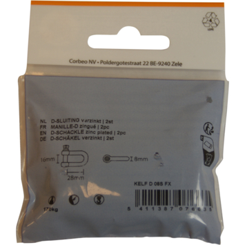 Sluiting in verzinkt staal in de vorm van een D, met lengte 28mm, dikte 8mm en bekopening 16mm. De D-sluiting wordt gebruikt voor het eenvoudig verbinden van koorden of kettingen. Ook eenvoudig en snel loskoppelen kan met deze sluiting. Set van 2 stuks in blister.
