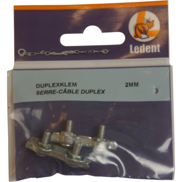 Dubbele klem laat toe om een draad doeltreffend te blokkeren en vast te klemmen met zekerheid. De draadklem maakt het mogelijk om snel en eenvoudig een wegneembare verbinding te creëren. Geschikt voor touw/kabel van 2mm. Door de verzinking wordt corrosie voorkomen en de levensduur van de draadklem verlengd. Set van 2 stuks in blister.
