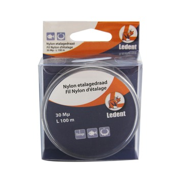 Etalagedraad in nylon met diameter 0,3mm en lengte 100m. Hoge treksterkte en goede knoopweerstand. Door de onzichtbaarheid is deze draad ideaal als etalagedraad. De etalagedraad is ook geschikt als vislijn, om juweelkralen te maken, …. In blister.