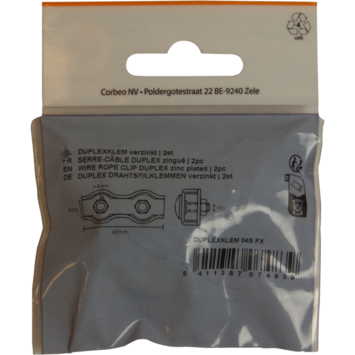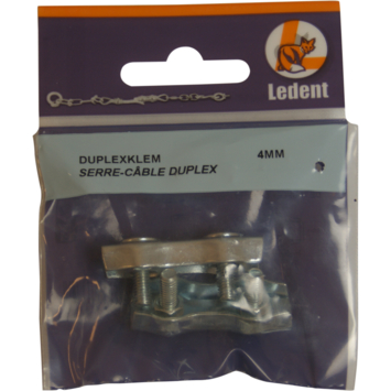 Dubbele klem laat toe om een draad doeltreffend te blokkeren en vast te klemmen met zekerheid. De draadklem maakt het mogelijk om snel en eenvoudig een wegneembare verbinding te creëren. Geschikt voor touw/kabel van 4mm. Door de verzinking wordt corrosie voorkomen en de levensduur van de draadklem verlengd. Set van 2 stuks in blister.