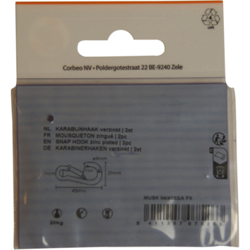 Deze karabijnhaak heeft een lengte van 40mm en een dikte van 4mm. Een karabijnhaak is dankzij het scharnierende deel geschikt om snel en eenvoudig dingen met elkaar te verbinden. Karabijnhaken komen goed van pas als u iets moet zekeren of op een eenvoudige manier aan elkaar moet bevestigen. De karabijnhaken zijn per 2 verpakt in een blister.