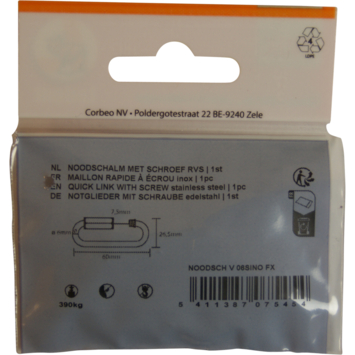 Ledent kettingsluiting 6 mm met moer rvs. De kettingsluiting is gemaakt van rvs en heeft een maximaal draagvermogen van 390kg.