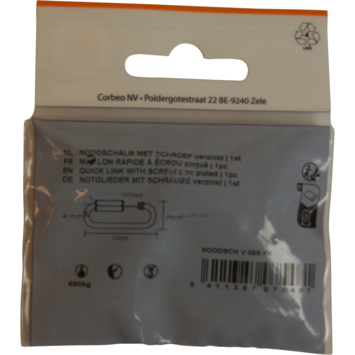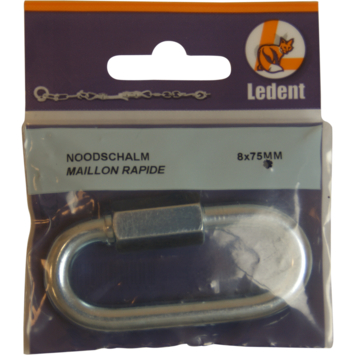Ledent noodschakel 8 mm met moer verzinkt. De noodschakel is gemaakt van verzinkt metaal en uitermate geschikt als (tijdelijke) vervanger van een gebroken schakel in een ketting. De schakel heeft een maximaal draagvermogen van 690kg.