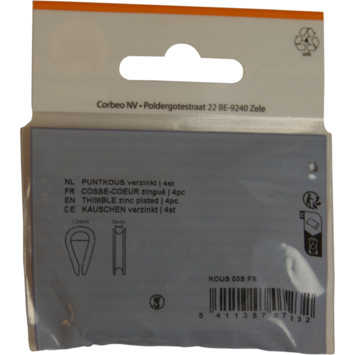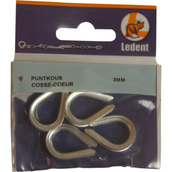 Puntkous voor koord of kabel van 3mm. Deze verzinkte puntkous is ideaal voor het maken van een lus aan het uiteinde van een koord of kabel. Ook geschikt om de koord te beschermen tegen doorslijten bij veelvuldige wrijving. De puntkous wordt dikwijls gecombineerd met een draadklem. Set van 4 stuks in blister.