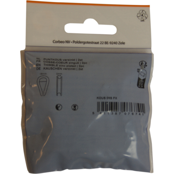 Puntkous voor koord of kabel van 8mm. De puntkous is ideaal voor het maken van een lus aan het uiteinde van een koord of kabel. Ook geschikt om de koord te beschermen tegen doorslijten bij veelvuldige wrijving. De puntkous wordt dikwijls gecombineerd met een draadklem. Set van 2 stuks in blister.