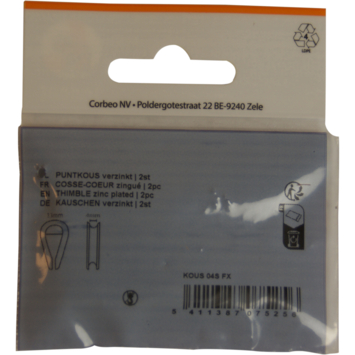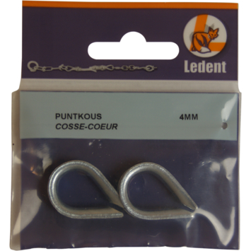 Puntkous voor koord of kabel van 4mm. Deze verzinkte puntkous is ideaal voor het maken van een lus aan het uiteinde van een koord of kabel. Ook geschikt om de koord te beschermen tegen doorslijten bij veelvuldige wrijving. De puntkous wordt dikwijls gecombineerd met een draadklem. Set van 4 stuks in blister.