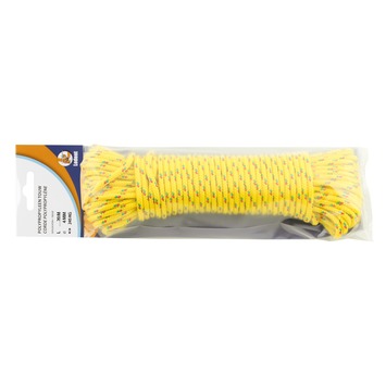 Gekleurd gevlochten polypropyleen touw met diameter 4mm en lengte 20m. Drijft op water en is bestand tegen wrijving. Veelzijdig gebruik in en om het huis. Kleur: hoofdkleur geel met rode en groene spikkels.