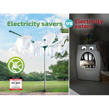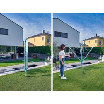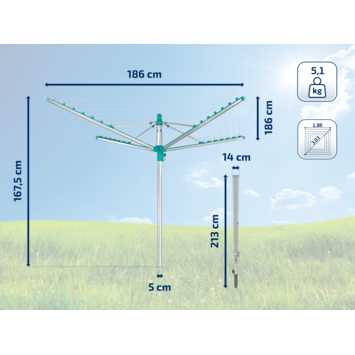 Met in totaal 40 meter aan waslijn biedt deze droogmolen ruimte voor maar liefst vier volle wasmachineladingen. Je was droogt op natuurlijke wijze in de buitenlucht – energiezuinig en milieuvriendelijk. Voor extra droogruimte kun je de apart verkrijgbare EasyClip gebruiken, ideaal voor klein wasgoed. De langste lijn is 1,86 meter – perfect voor groot textiel zoals lakens, dekbedden en badhanddoeken, en toch compact genoeg voor een kleinere tuin of terras.