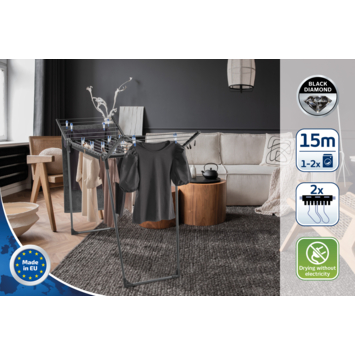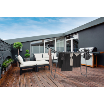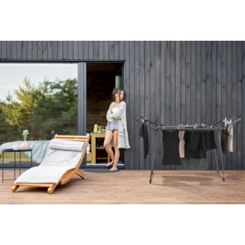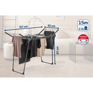 De antislipvoetjes zorgen ervoor dat het droogrek stevig blijft staan, of je het nu op het balkon, in de tuin of op een gladde vloer binnenshuis gebruikt. Met een totale drooglengte van 15 meter kun je bijna twee volle wasmachineladingen tegelijk ophangen. De vleugels, met een hoogte van 1,05 meter, zijn ideaal voor langere stukken wasgoed.