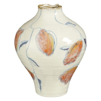 De Liana vaas is een prachtige vaas voor in een klassiek interieur. De vaas is gemaakt van klei met een geglazuurde afwerking en heeft een crèmekleurige basis met een bloemenmotief in oranje en blauw. Hij heeft een hoogte van 32,5 cm en een diameter van 25 cm. De opening met een diameter van 10 cm maakt hem geschikt een klein boeket of enkele losse takken, maar ook zonder bloemen staat de vaas prachtig in je interieur.