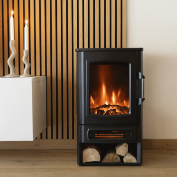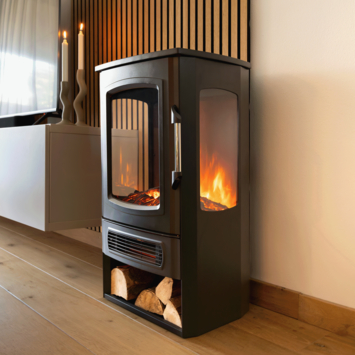 Creëer een warme en gezellige sfeer in huis met deze stijlvolle vrijstaande kachel met opslagruimte voor houtblokken. Dankzij de panoramische zijramen geniet je vanuit elke hoek van het realistische LED-vlambeeld.