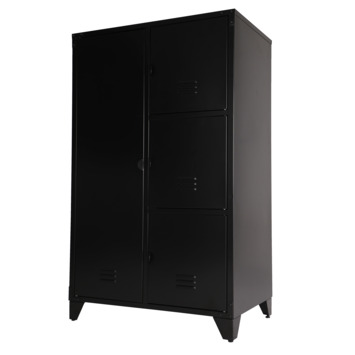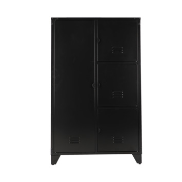 Lockerkast Jax laag metaal grijs is een functioneel en modern uitziend nachtkastje gemaakt van metaal met een vergrijsde zwarte coating. Het meubel heeft 3 vakken en 1 vak met een deur. De lockerkast kan gebruikt worden om spullen in op te bergen. Het past in veel stijlen en ruimtes in het huis en heeft een strak uiterlijk. Lockerkast Jax laag is ook verkrijgbaar in een hoog model lockerkast 190 centimeter hoog en een nachtkastje.