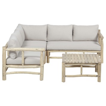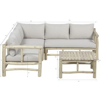 De loungeset Casablanca is een comfortabele hoekbank met een hippe uitstraling. Met deze set haal je sfeer in je tuin. De set bestaat uit een fijne loungebank met een bijpassende tafel. Het gebruikte materiaal is hardhout, voorbehandeld met olie. Deze loungeset is geschikt voor 5 personen. Afmetingen bank: (hxbxd) 70cm x 220 x 220 cm Afmetingen tafel: (hxbxd) 40cm x 180cm x 80cm