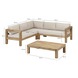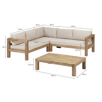 De hoekbank is 80 centimeter hoog, 227 centimeter breed en 227 centimeter diep. De tafel is 100 centimeter lang, 80 centimeter breed en 33 centimeter hoog.