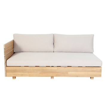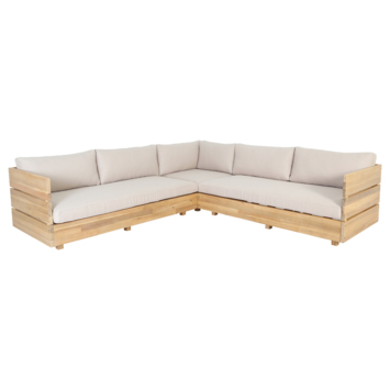 Acacia houten onderstel. De bank en kussens zijn gemaakt van stof.