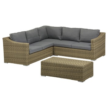 De Loungeset Desina beige is een moderne loungeset die bestaat uit een hoekbank en een tafel. De beige wicker heeft een ruwe en natuurlijke uitstraling. Met de rustige kleurencombinatie van beige wicker en de grijze kussens staat deze combinatie prachtig in vrijwel elke tuin. De loungeset is royaal qua formaat en voorzien van comfortabele zit- en rugkussens om heerlijk te relaxen. De glasplaat, stoel en zijkussen worden niet meegeleverd.
