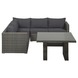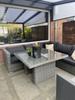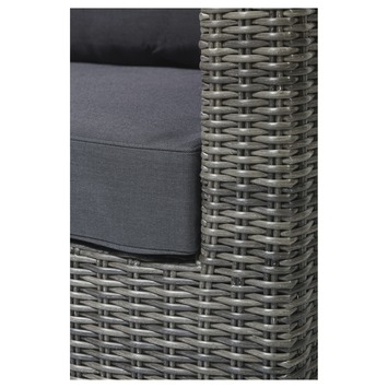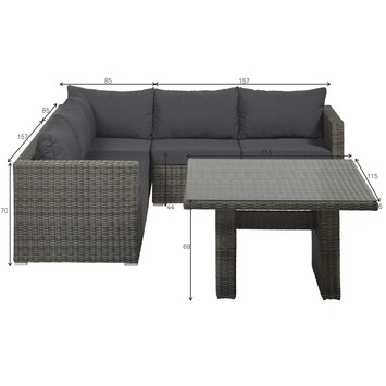 De High dining set Napels is een mooie grote high dining set. Het voordeel van de set Napels is dat je er in kunt loungen en aan kunt dineren door zijn hoge tafel. De set bestaat uit een hoekbank en een grote tafel. De set is gemaakt van grijs halfrond wicker. Het voordeel van wicker is dat het makkelijk reinigbaar is. De set heeft een aluminium onderstel waardoor hij niet kan gaan roesten. De bijpassende tafel is gemaakt van aluminium en heeft een glazen tafelblad. De kussens zijn goed gevuld en zijn van een luxe stof gemaakt.
