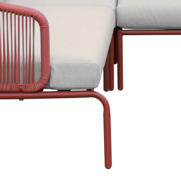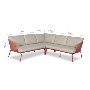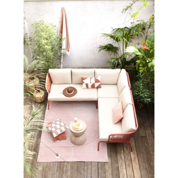 Deze loungeset Kopenhagen in terracotta is de perfecte combinatie van stijl en comfort voor je tuin of terras. Deze hoekbank biedt ruimte aan vijf personen en heeft een stevig terracotta metalen frame. De leuningen zijn uitgevoerd in kunststof, wat zorgt voor een moderne uitstraling en onderhoudsvriendelijkheid. Voor extra comfort wordt de set geleverd met zachte, bijpassende zit- en rugkussens.