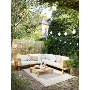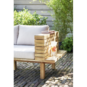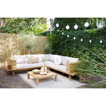 De loungeset Lissabon is riante 5 persoons set om in te loungen. Deze houten set kenmerkt zich door de strakke vormen en comfortabele kussens. Door haar zachte tinten geeft deze set je tuin direct een chalet gevoel met een moderne twist. De loungeset Lissabon is een echte eyecatcher op jouw terras of in de tuin en erg praktisch door de extra planken aan beide zijdes van de bank, wat zich perfect leent voor je drankje of decoratie.