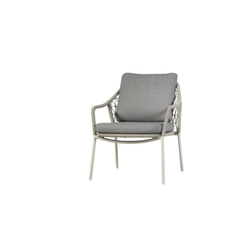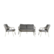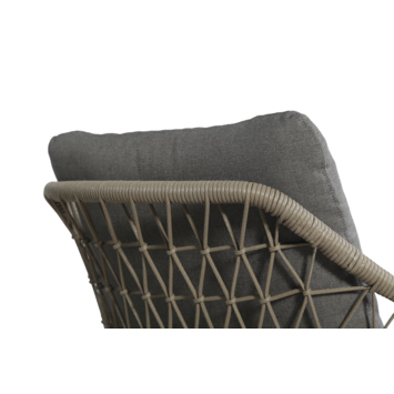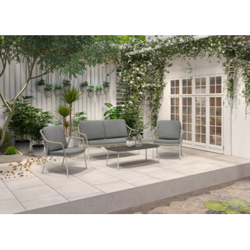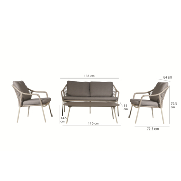 Deze loungeset bestaat uit een 2-zitsbank, twee losse fauteuils en een bijzettafel. De bijpassende grijze zit- en rugkussens zorgen voor extra comfort en maken de set compleet. Of je nu een boek wilt lezen in de zon of gezellig samen een drankje wilt doen, deze loungeset biedt de ideale plek om te ontspannen.