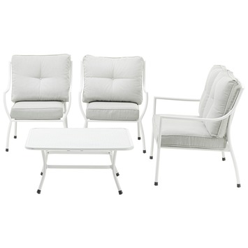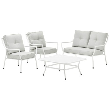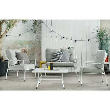 De Loungeset Nola grijs bestaat uit een tweezitsbank, twee eenpersoonsstoelen en een bijzettafel. Ideaal dus om met maximaal vier personen te genieten van bijvoorbeeld een zomers zonnetje of een warme zomeravond. De stoelen beschikken over dikke kussens, waardoor je gegarandeerd bent van ultiem zitcomfort. Doordat het onderstel van deze stoelen gemaakt is van metaal, zijn deze stoelen bovendien zeer stevig.