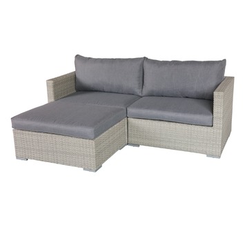 De loungeset Portomari is een modulaire loungeset gemaakt van kunststof wicker. De loungeset is uitgevoerd met dubbel halfrond grijs wicker. De set bestaat uit losse delen waardoor de set in verschillende opties neergezet kan worden. Het ideale van wicker is dat het makkelijk reinigbaar is. De set is uitgevoerd met luxe dikke kussens. De stof van de kussens is waterafstotend en UV bestendig waardoor de kleur van de kussens lang behouden blijft. Loungeset Portomari is 65 centimeter hoog, 93 centimeter breed en 73 centimeter diep.