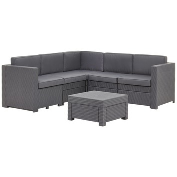 De Loungeset Provence is een fraaie loungeset. De loungeset is gemaakt van kunststof met een wicker-uitstraling en heeft een donkergrijze kleur. De kussens sluiten perfect aan op de set en zorgen voor een stijlvol geheel. En bovendien zorgen ze voor comfort. Geniet met deze van de zomerse dagen in jouw tuin. De loungeset biedt plaats aan vijf personen en kan de centrale plek vormen in jouw tuin of op jouw terras.