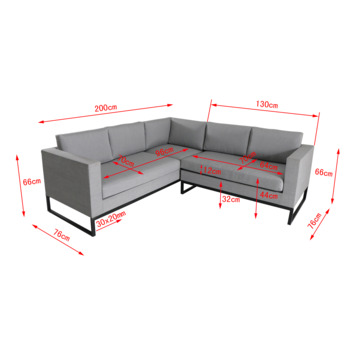 De loungeset Ruby is centimeter hoog, 130 centimeter breed en 200 centimeter diep met een zitdiepte van 64 centimeter. De dikte van de zit- en rugkussens is 12 centimeter.