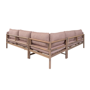 De Emma loungeset in bruin hout met terracotta, stevige kussens biedt een comfortabele en uitnodigende zithoek voor vier personen. Perfect om te loungen, relaxen of borrelen met vrienden.