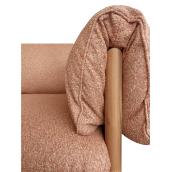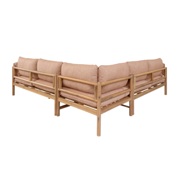 De Emma loungeset van bruin hout met terracotta kussens en stevige zitkussens creëert een comfortabele en uitnodigende zithoek voor vier personen. Perfect om te loungen, relaxen of borrelen met vrienden.