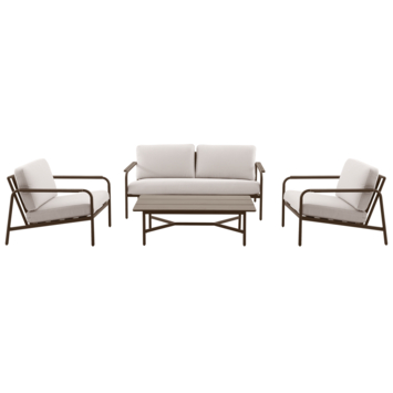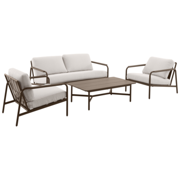Deze loungeset Maxime in bruin metaal met beige kussens geeft je tuin of terras direct een verzorgde uitstraling en biedt comfortabel zitplezier voor vier personen.