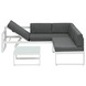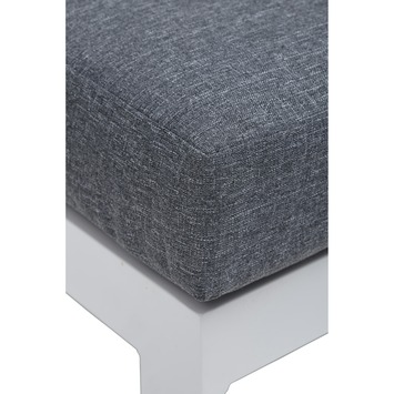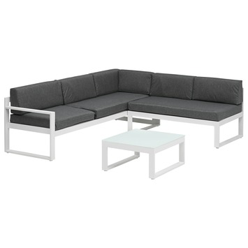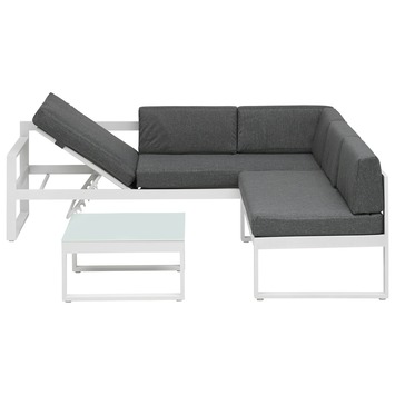 De loungeset Victoria is een moderne loungeset. De set bestaat uit een hoekbank met rug- en zitkussens van luxe stof en een salontafel. Het frame is gemaakt van aluminium en is wit van kleur, hierdoor heeft de bank een moderne en strakke uitstraling. De kussens zijn grijs van kleur, samen met het witte frame zorgen de kussens voor een stijlvol geheel. De hoekzitting kan omhoog worden gezet, zo creeer je een ideale ligstand en kun je heerlijk loungen. De loungeset wordt geleverd met 3 zitkussens en 6 rugkussens.