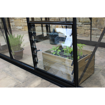 Het zwart gecoate louvreraam 6L is 610 x 610 mm en is geschikt voor de zwarte tuinkas Qube, Birdlip, Burford en Blockley. Een louvreraam is een lamellenraam, een aanvulling op de dakra(a)m(en) die al aanwezig zijn in de kas. Dit louvreraam is voorzien van 6 lamellen van veiligheidsglas die in horizontale stand geopend kunnen worden, of in verticale stand overlappen, en daarmee het raam sluiten. Voor een louvreraam is een automatische louvreraamopener optioneel verkrijgbaar.