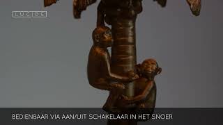 Een functionele tafellamp combineren met een speels, extravagant interieuraccent? Extravaganza Coconut doet het voor jou. Onder de klassiek ogende katoenen lampenkap speelt zich een exotisch tafereel af. Twee chimpanzees klimmen er in een palmboom. De ene plukt gretig kokosnoten terwijl de andere, kleinere aap goedkeurend toekijkt. De kruin van de boom wordt extra uitgelicht door de lamp, die haar licht difuus verspreidt. Het kunststof armatuur is een halve meter hoog en is compatibel met een ledlamp. Het licht aan en uit schakelen doe je eenvoudig met de schakelaar op het snoer. Geniet van het schouwspel en van de nieuwe blikvanger in je interieur.