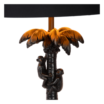 Een functionele tafellamp combineren met een speels, extravagant interieuraccent? Extravaganza Coconut doet het voor jou. Onder de klassiek ogende katoenen lampenkap speelt zich een exotisch tafereel af. Twee chimpanzees klimmen er in een palmboom. De ene plukt gretig kokosnoten terwijl de andere, kleinere aap goedkeurend toekijkt. De kruin van de boom wordt extra uitgelicht door de lamp, die haar licht difuus verspreidt. Het kunststof armatuur is een halve meter hoog en is compatibel met een ledlamp. Het licht aan en uit schakelen doe je eenvoudig met de schakelaar op het snoer. Geniet van het schouwspel en van de nieuwe blikvanger in je interieur.